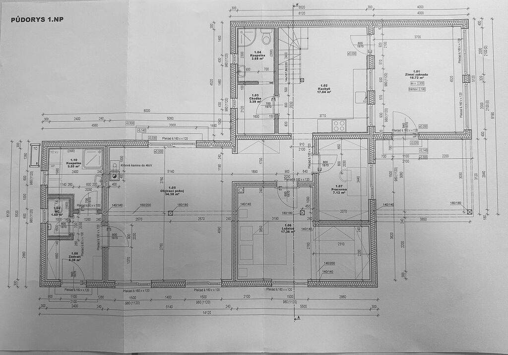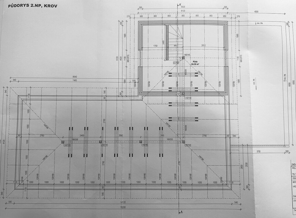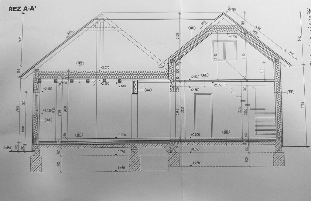 Podkroví je plně zatepleno minerální izolací 16 cm + 6 cm do kříže, zaklopené sádrokartonem. Konstrukce krovu je dimenzována na budoucí přístavbu dle projektové dokumentace.