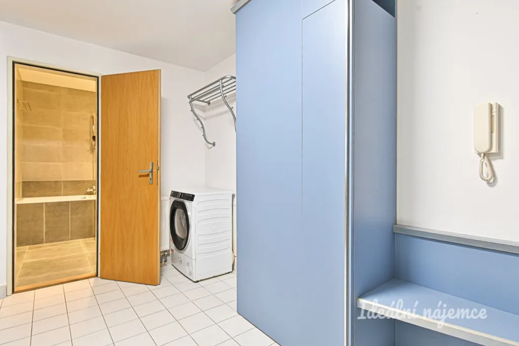 V předsíni je vestavěná skříň. Kuchyňská linka je vybavena lednicí s mrazákem, myčkou, elektrickou troubou, varnou deskou, mikrovlnnou troubou a digestoří. Součástí kuchyně je také barový pult s židlemi. Obývací prostor je zařízen pohovkou, konferenčním stolem a skříní. Oddělená část bytu je vybavena postelí. Koupelna disponuje vanou, umyvadlem, toaletou a pračkou se sušičkou. K dispozici je také úložná skříňka pro větší pohodlí.