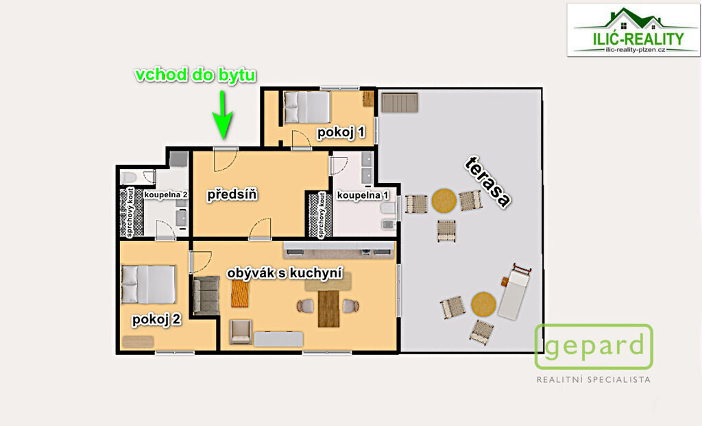 Byt disponuje prostornou chodbou s vestavěnými skříněmi, ložnicí s vlastní šatnou, dalším samostatným pokojem, moderní světlou kuchyní propojenou s obývacím pokojem. Byt disponuje dvěma prostornými koupelnami, z nichž každá je vybavena moderním sprchovým koutem. Velkým benefitem je klimatizace umístěná přímo v bytě.