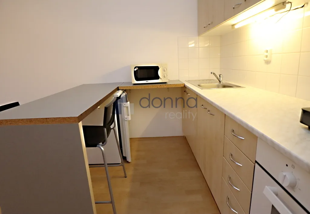 Je zde plně vybavená kuchyňská linka: s 2 plotýnkou, elektrickou troubou, mikrovlnnou troubou, digestoří a malou lednicí s integrovaným mrazákem. Barový stůl se 2 židlemi, sektorová skříňka.