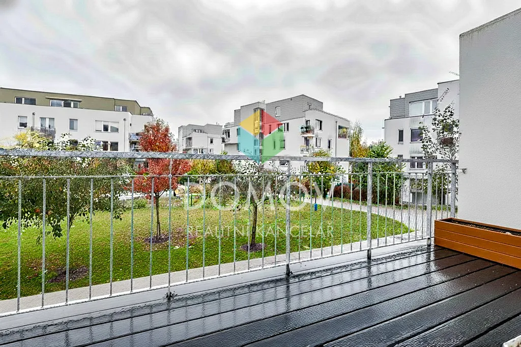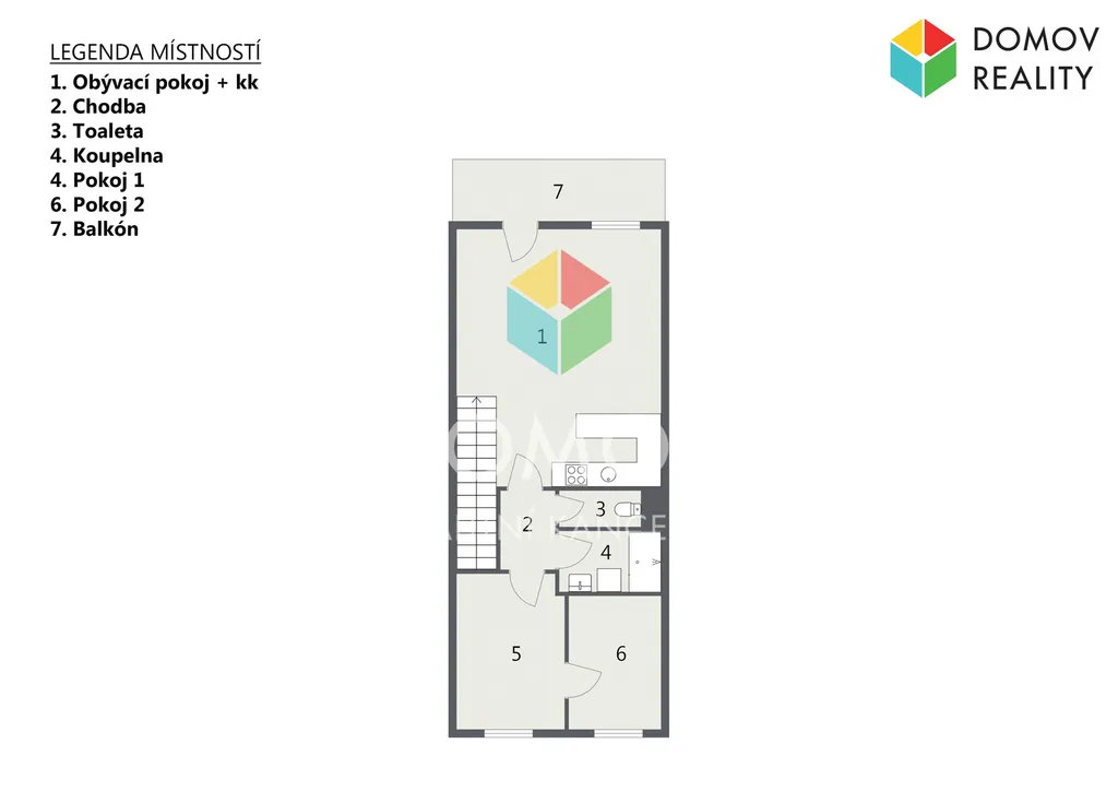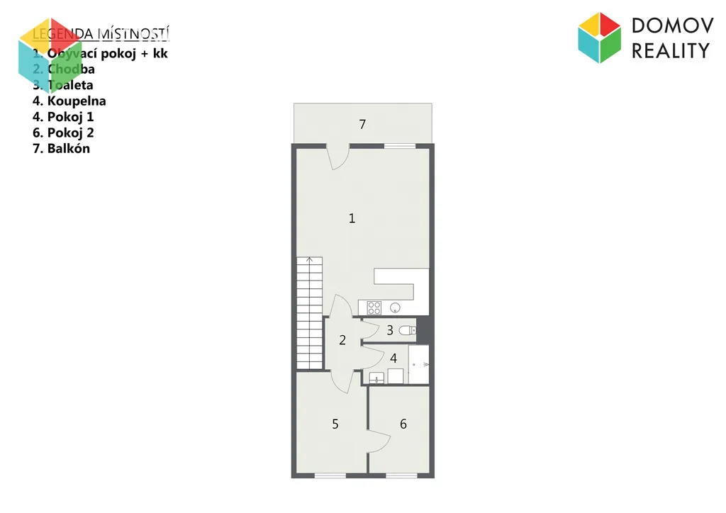 Moderně vybavená kuchyň s kuchyňskou linkou a spotřebiči volně navazuje na obývací pokoj, ze kterého je přístup na prostorný balkon. Dále se v bytě nacházejí dva samostatné pokoje.