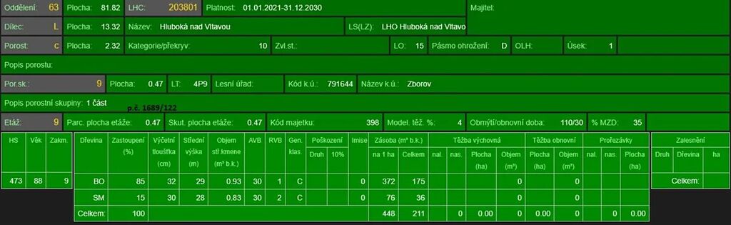 - p.č. 1689/122 vedená jako lesní pozemek o celkové výměře 23 149 m2, vlastníme podíl 1/8 tedy 2 894 m2 (stáří lesa 147 let - zastoupení dřevin smrk, borovice, stáří lesa 109 let - zastoupení dřevin borovice, smrk, stáří lesa 92 let - zastoupení dřevin borovice, smrk, stáří lesa 18 let - zastoupení dřevin borovice)