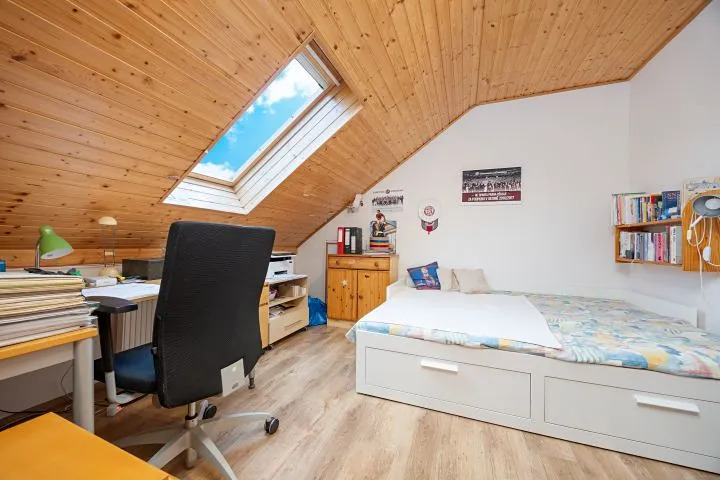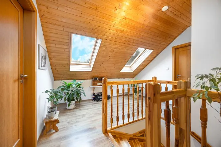 - Dispozice 5+kk, přízemí: vstup, technická místnost, WC pro hosty, vstup do jídelny a kuchyně, která je z části propojená s prostorným obývacím pokojem a vstupem na zastřešenou terasu s venkovním sezením , ložnice (pokoj pro hosty), koupelna, schodiště do patra : chodba, ložnice, dětský pokoj s půdičkou (možnost spaní), pracovna ( dětský pokoj), koupelna s WC.