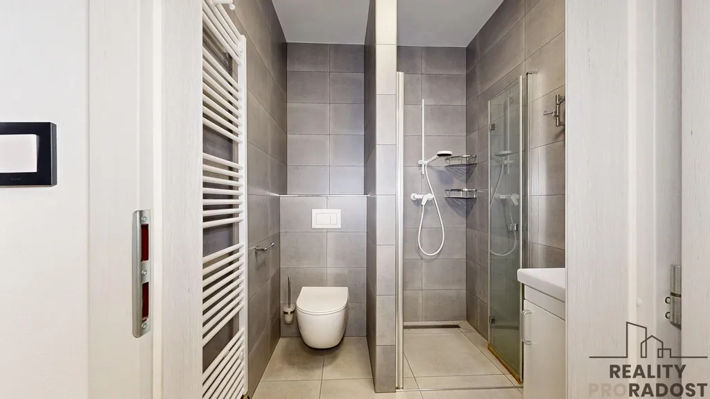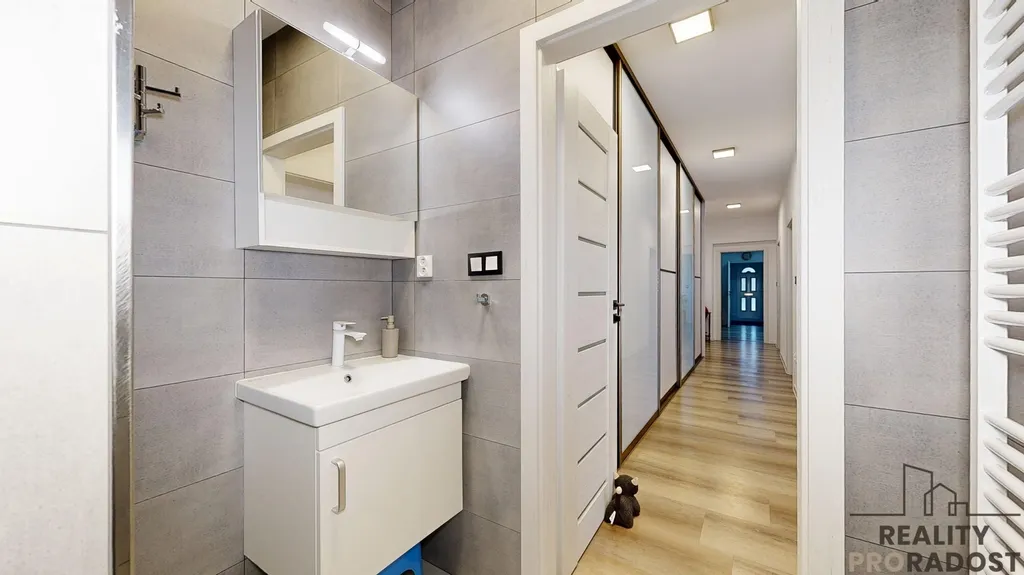 - vestavěná skříň po celé délce chodby – výjimečně velký úložný prostor