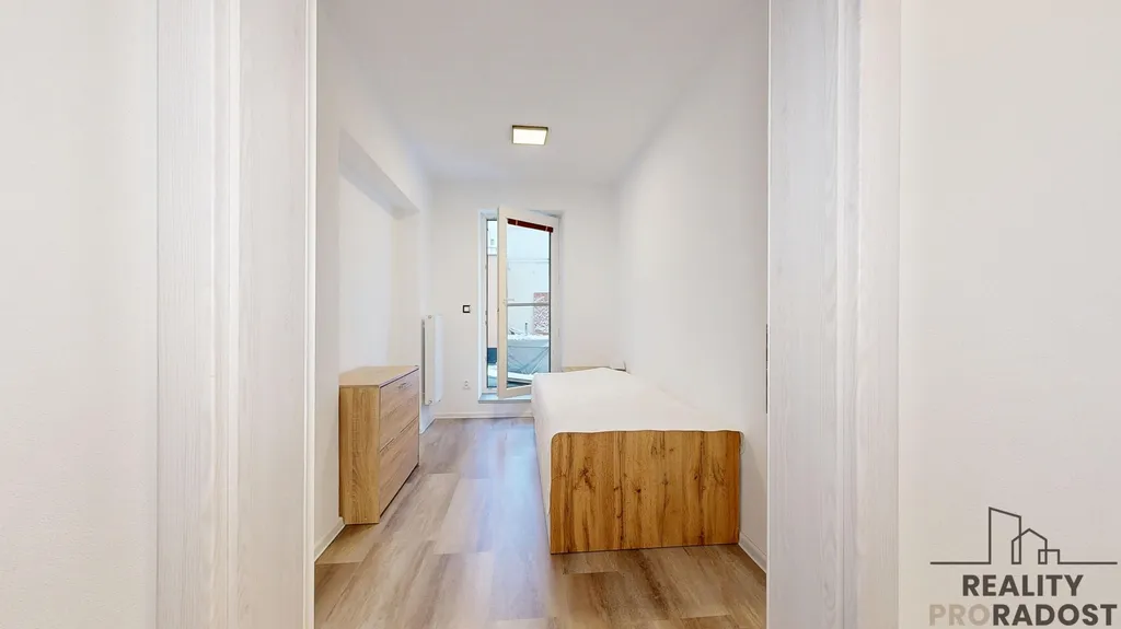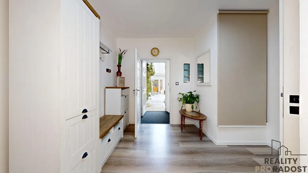 Chodba se skříní po celé délce poskytuje mimořádné množství úložných prostor, díky čemuž není potřeba velkých skříní v pokojích.