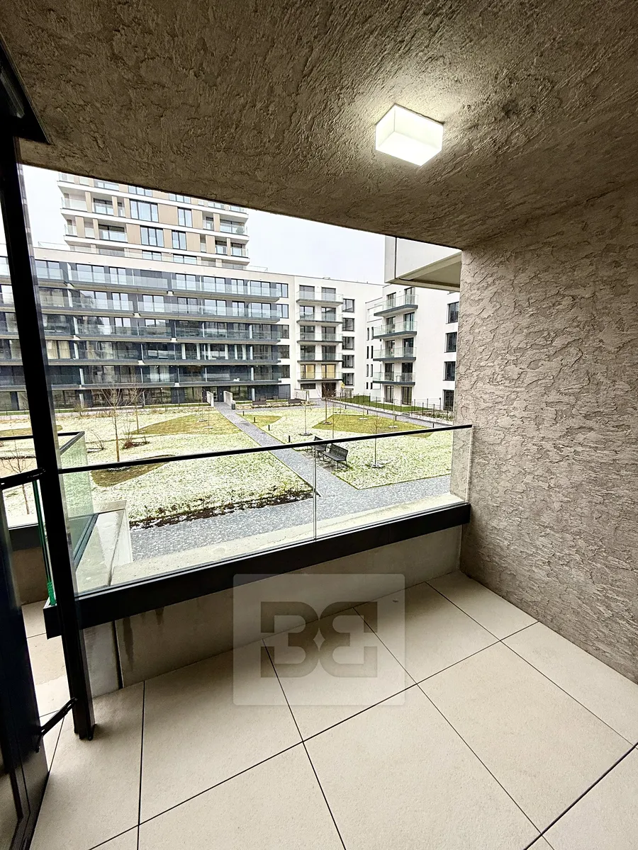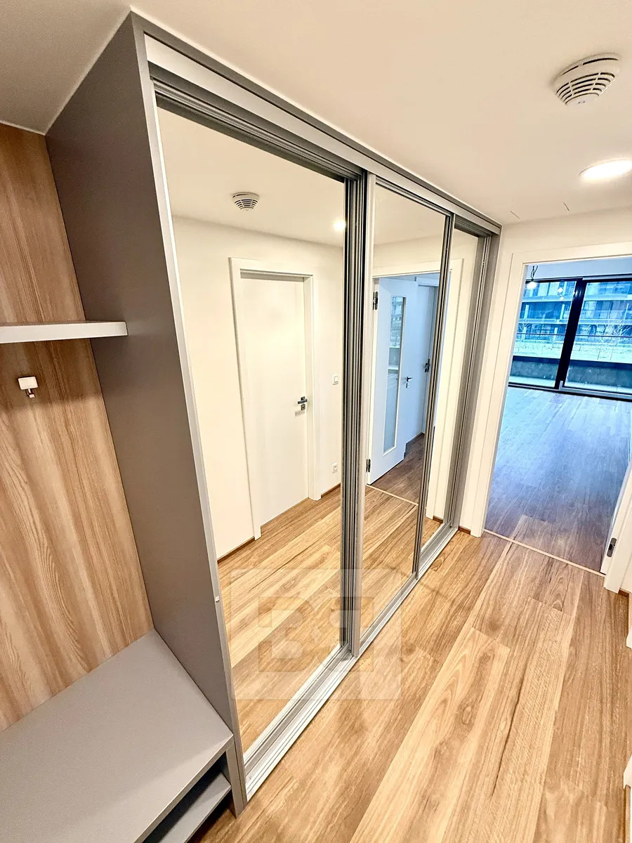 V bytě, který je orientován do klidného vnitrobloku, je nově instalovaná kuchyňská linka s vestavěnými spotřebiči (indukční deska, myčka, lednice s mrazákem, myčka, pečící a mikrovlnná trouba), vestavěná skříň v předsíni, komfort zvyšuje rekuperace a klimatizace (v obou místnostech), bezpečí podpoří alarm či venkovní bezpečnostní polohovatelné žaluzie. Byt bude vybaven světly, skříní a v případě zájmu eventuelně postelí (viz.foto) či na přání majitele i pračkou. K jednotce přísluší parkovací stání a sklepní kóje.