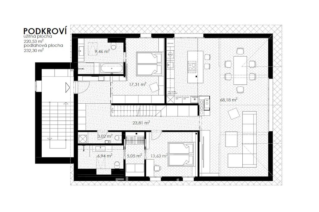 - rozlehlá chodba s množstvím úložných prostor zajištěného vestavěnými skříněmi