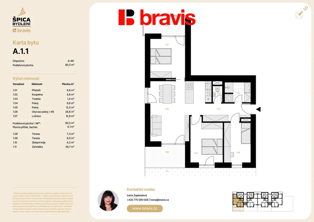 Nabízíme exkluzivní bytovou jednotku 4+kk (bytová jednotka A1-1) v novém projektu Špica bydlení — byt umístěný v přízemí nízkoenergetického bytového domu A. Celková podlahová plocha 80,5 m2 s terasou 16,7 m2, zahrádkou 38,7 m2, sklepem 4,2 m2 a vlastní parkovací stání, to vše v ceně bytu.