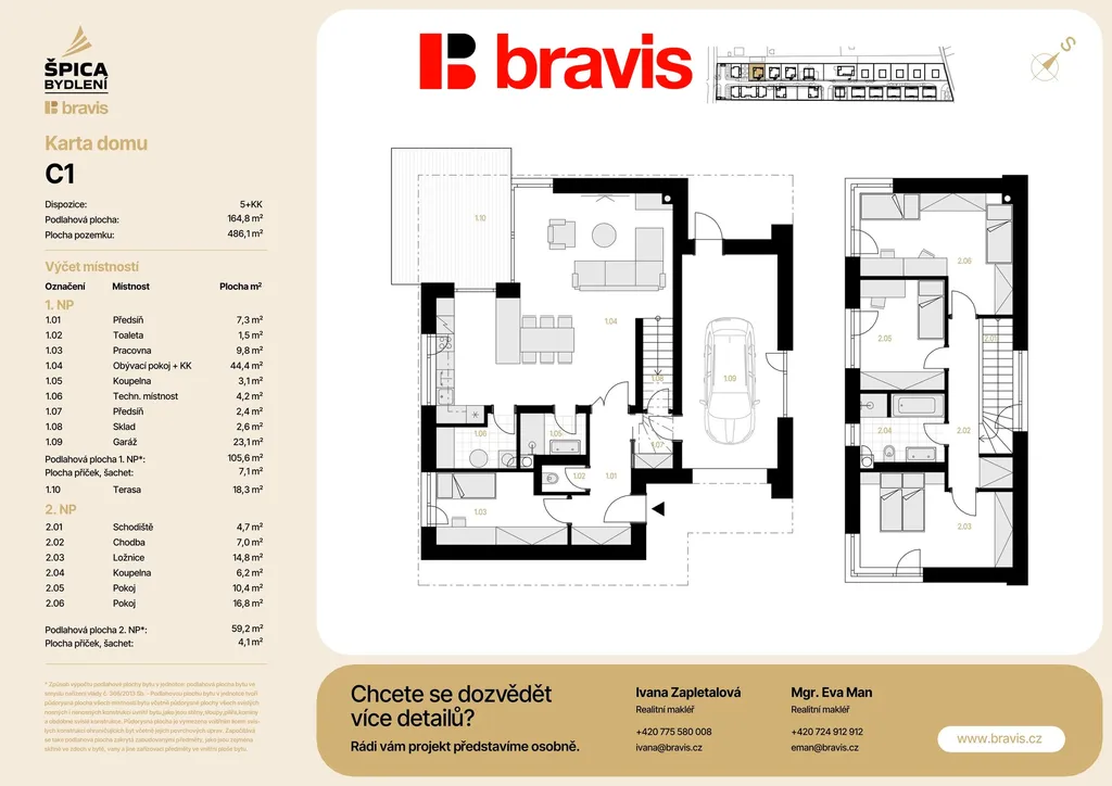 Nabízíme exkluzivní rodinný dům označený C1 o dispozici 5+kk, zahrada 279,8 m, garáž 23,3 m2, plocha zpevněná 65,8 m2, v novém projektu Špica bydlení. Dům o celkové výměře 164,8 m2 na pozemku 486,1 m2, plocha pozemku bez domu 362,7 m2.