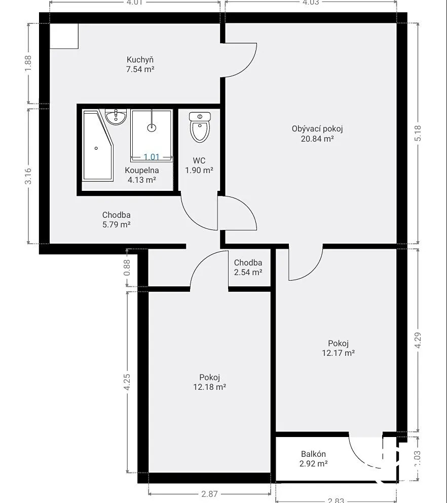 Byt prošel rekonstrukcí jádra, rozvodů vody a odpadu, výměnou elektroinstalace, novým topením v letech 2015-2017. Nemovitost sestává ze vstupní chodby, samostatné kuchyně s linkou, kombinovaným sporákem, myčkou nádobí a jídelním koutem, koupelny s vanou, sprchovým koutem a umyvadlem, samostatné toalety, obývacího pokoje průchozího s kuchyně a chodby. Dalších dvou neprůchozích pokojů, kdy z posledního z nich vstoupíme na krytý prostorný balkon.