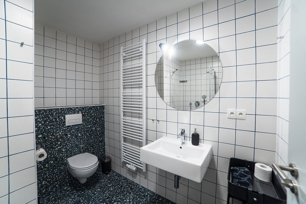 Koupelna je vybavena umyvadlem, zrcadlem, WC, sprchovým koutem, úložným boxem, ventilátorem a topným žebříkem.