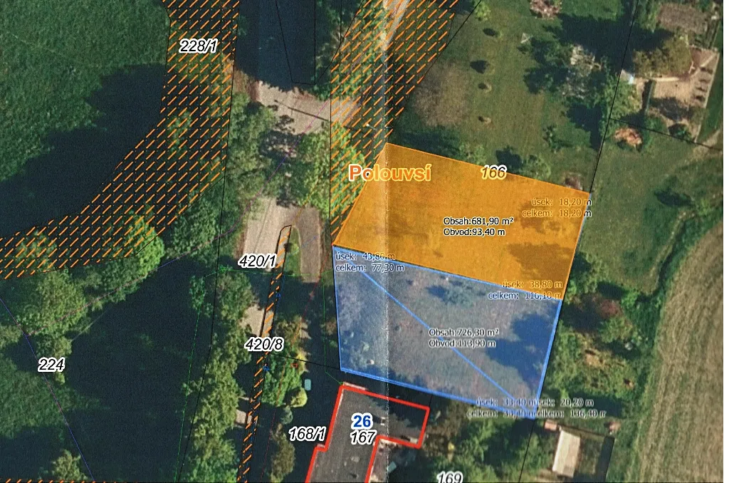 Jedná se o dva pozemky o výměře cca 700 m2 nebo lze tyto dva pozemky sloučit na jeden samostatný pozemek a upravit výměru podle potřeby kupujícího.