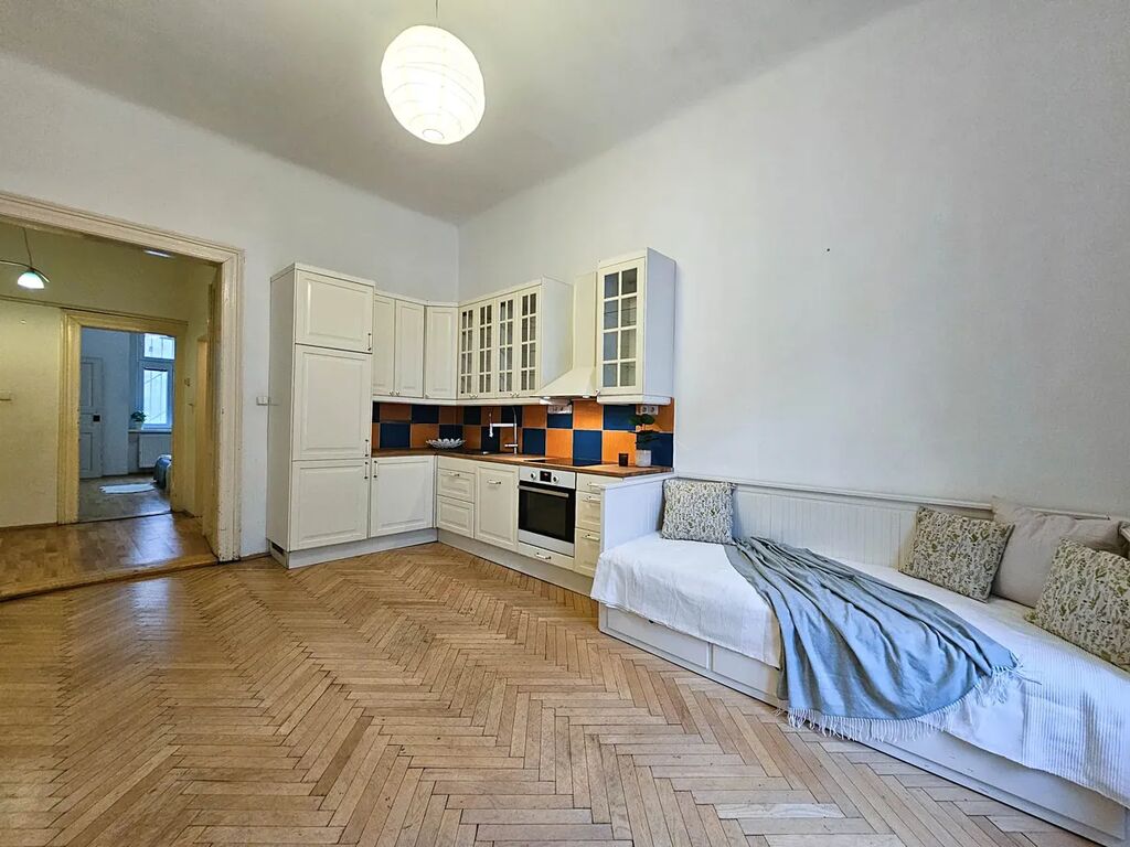 V bytě je prostorná předsíň, veliký dětský pokoj s komorou a oknem do dvora, ložnice rodičů s vestavěnou skříní a okny do ulice a obytná kuchyň s plně vybavenou linkou (varná deska, trouba, myčka, lednice), postelí pro hosty a knihovnami. Průchozí je pouze kuchyň, jinak pokoje samostatné. Krásné vysoké stropy. Byt se nabízí s vybavením jako na fotkách (pouze bez dekorací).