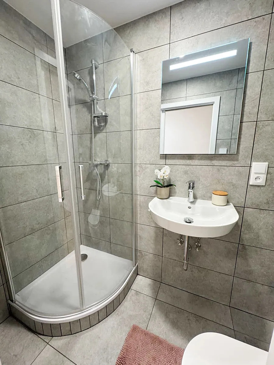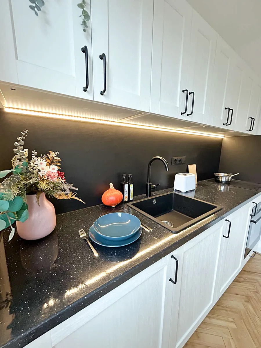 Byt disponuje vstupní chodbou se skříní, obytným pokojem s moderní kuchyňskou linkou, vestavěnou lednicí, pračkou a dostatkem úložného prostoru. Koupelna je vybavena sprchovým koutem a toaletou. Celý interiér je laděn v moderním stylu a nabízí příjemnou atmosféru pro každodenní život.