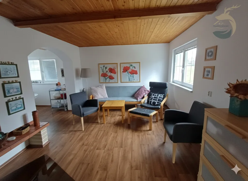 Vstoupíte do předsíně, odkud se otevře obývací prostor propojený s kuchyní, kde dominuje krb, který dokáže během chvilky vytvořit teplo nejen v místnosti, ale i v duši. V podkroví se nachází velký pokoj – ideální pro spaní, děti, hosty nebo jako romantické zázemí pod střechou.