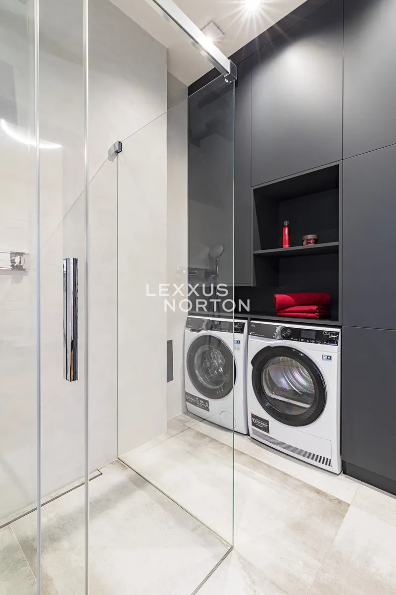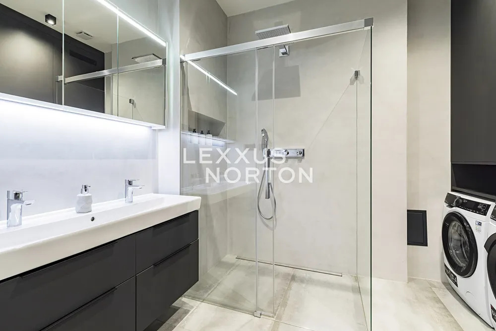 Celý byt prošel kvalitní rekonstrukcí s důrazem na moderní design a funkčnost. Podlahy tvoří masivní dubové parkety, mezi místnostmi jsou osazeny elegantní bezfalcové dveře s designovými černými klikami, které harmonicky ladí s tmavými radiátory. Kuchyňská linka v matném antracitovém provedení je vybavena vestavnými spotřebiči značky AEG. Stylová koupelna nabízí prostorný walk-in sprchový kout, dvojumyvadlo s podsvíceným zrcadlem a skříň s pračkou a sušičkou. Vytápění zajišťuje plynový kotel Buderus, okna jsou původní dřevěná špaletová.