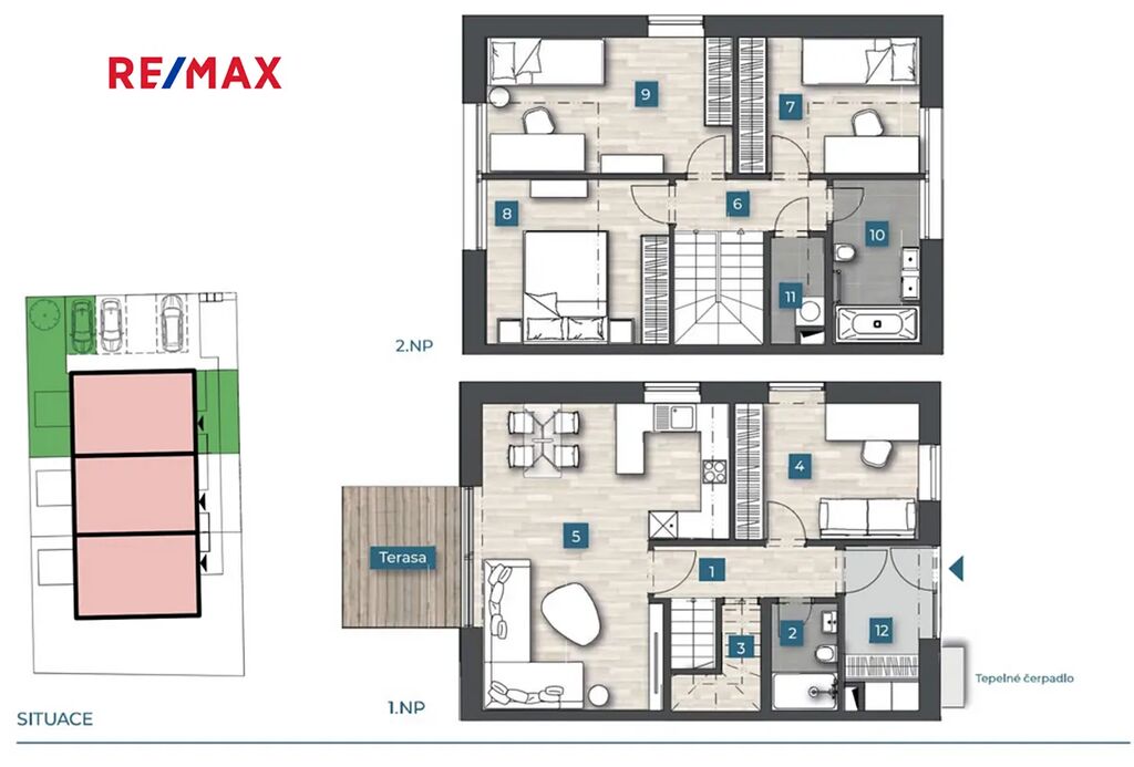 Každý dům nabízí do detailu promyšlenou dispozici 5+kk - 4 samostatné pokoje, obývací pokoj s kuchyňským koutem, 2 koupelny a technickou místnost. Venku posedíte na terase či na zahradě a před domem zaparkujete dva své vozy.