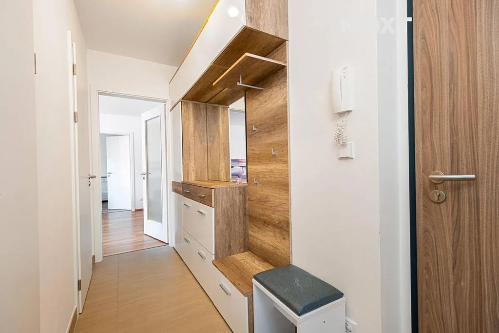 Dispozice bytu: vstupní chodba, šatna s prostorem pro pračku a sušičku, koupelna s vanou, samostatné WC s umyvadlem, obývací pokoj s kuchyňským koutem a vstupem na balkón, ložnice, pokoj.