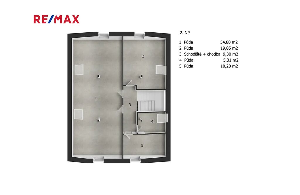 Horní patro je aktuálně kolaudovaná jako půda a je ve fázi rekonstrukce na obytný prostor. V 2NP se nachází zateplení a jsou zde umístěna okna včetně těch střešních. Lze zde vybudovat až tři obytné místnosti a samostatnou koupelnu podle vlastních představ. Druhé patro nabízí možnost až 90 m².