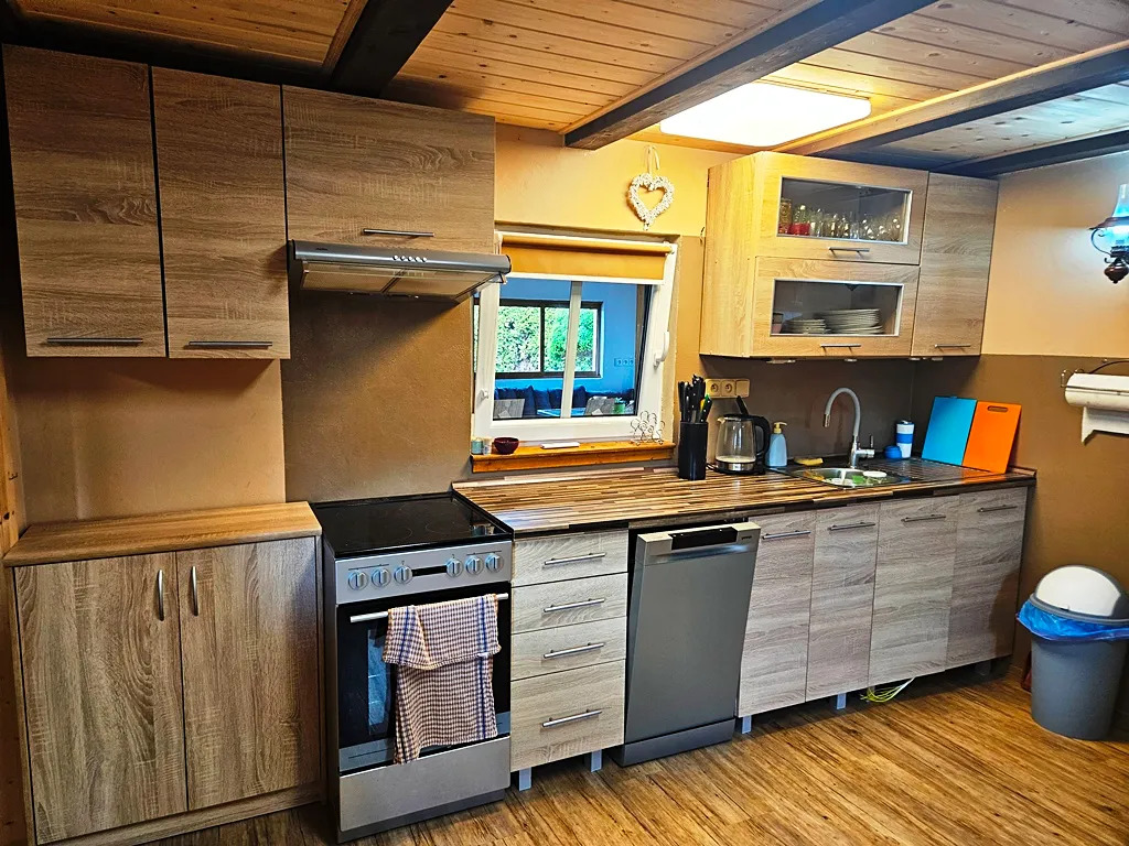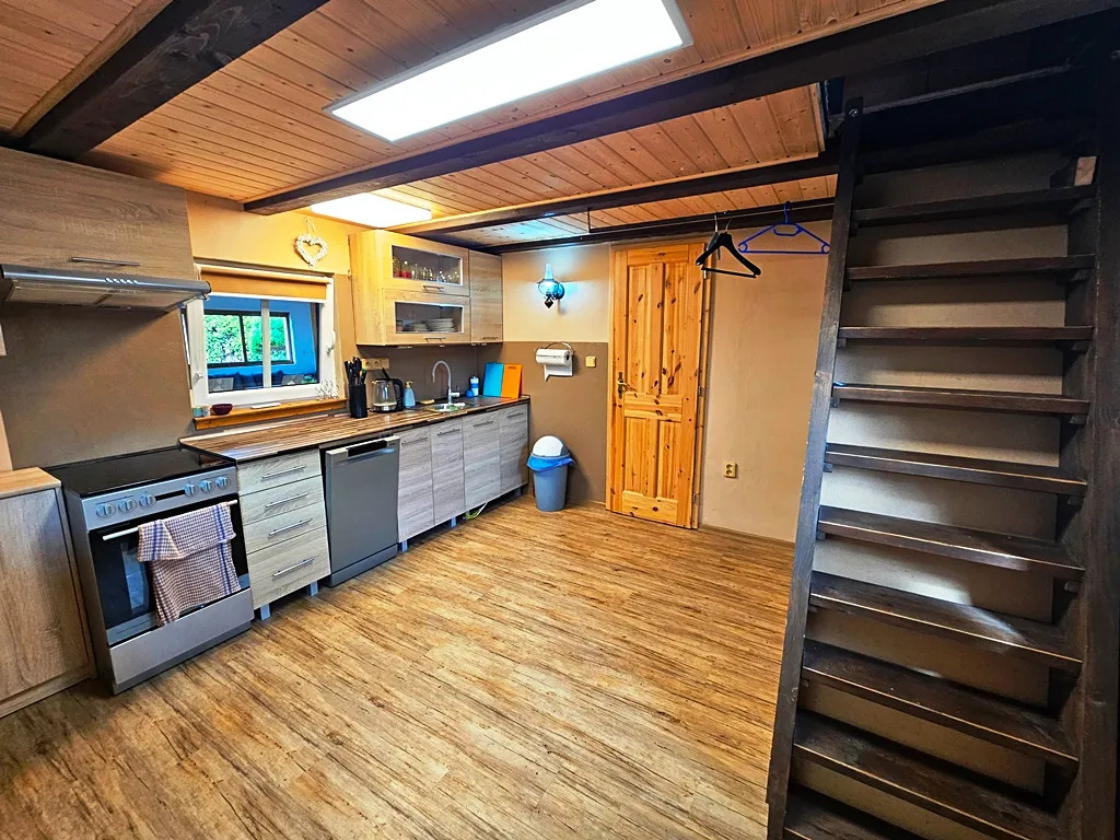 Po vstupu do chaty vstoupíme na verandu, v levé části je samostatná, prostorná místnost, rovně se dostaneme do kuchyně s obývacím pokojem. Vlevo je koupelna se sprchovým koutem a toaletou, vpravo prostor pro spaní. Z kuchyně vede schodiště do podkroví. V domě je klimatizační jednotka, která slouží i pro vytápění.