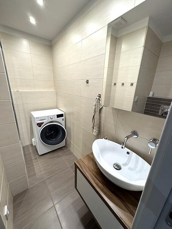 Vstupními dveřmi vejdeme do předsíně o výměře cca 8 m². V předsíni je polička na klíče a zrcadlo. Z této je vstup do všech místností v bytě včetně kuchyně, která je vybavena nádhernou kuchyňskou linkou včetně vestavných spotřebičů, jejíž celková plocha činí cca 9 m². Součástí kuchyňské linky je lednice s mrazákem, myčka, plynový sporák, trouba, digestoř, mikrovlnná trouba, kávovar a domácí gril. Další místností v bytě je obývací pokoj o výměře cca 16 m². V obývacím pokoji je rohová sedačka, konferenční stolek, stolek pod televizi, jídelní stolek a dvě židle, pracovní stůl se židlí a taburet. Ložnice o výměře cca 19 m², jejíž dominantou je balkón s výhledem do okolí s výměrou cca 4 m². Na balkóně je posezení pro dva se stolečkem. Ložnice je vybavena vestavnou skříní a postelí s konferenčními stolky a lampičkami. Nesmíme opomenout nádhernou koupelnu o výměře cca 5 m² a praktickou komoru o výměře cca 3 m². V koupelně je pračka, umyvadlo, WC a prostorná osvětlená sprcha. V komoře jsou dva regály na ramínky.