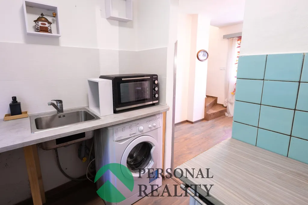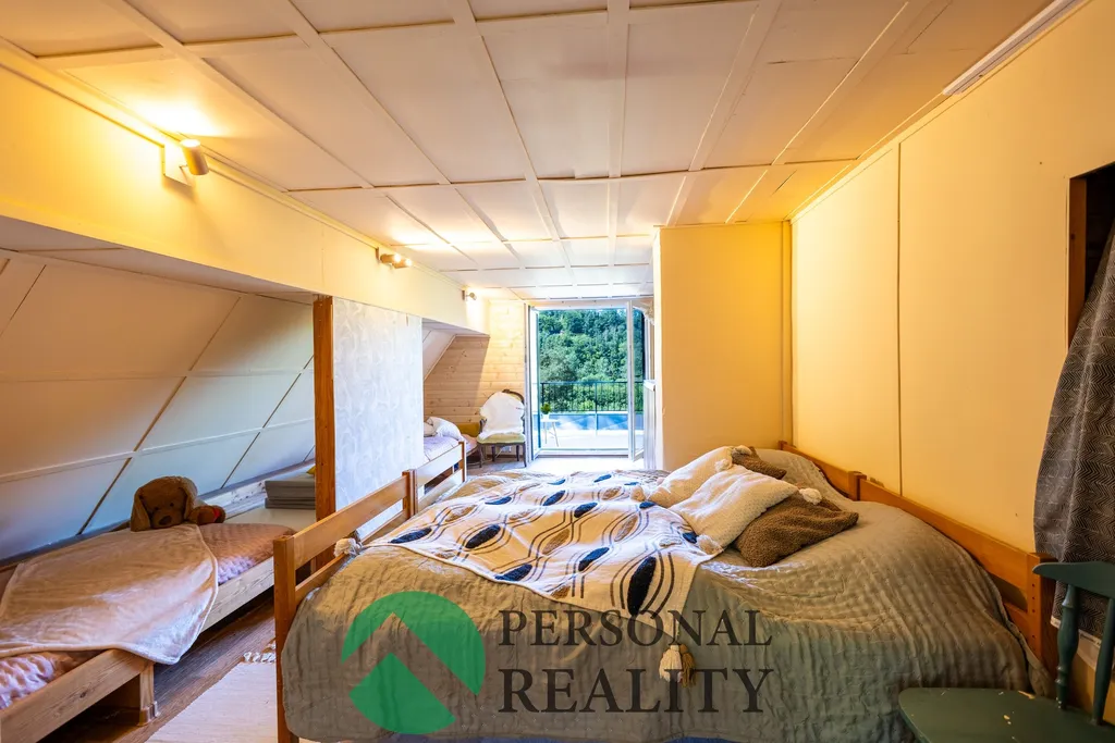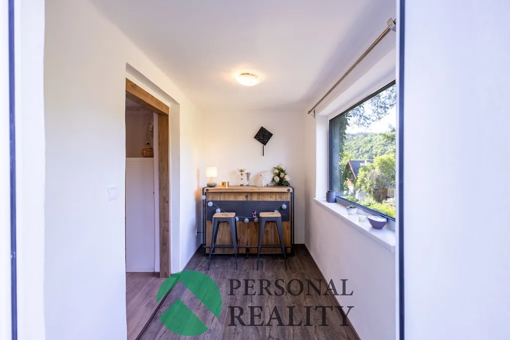 Dispozice přízemí: koupelna s WC, chodba, kuchyně, jídelna, obývací pokoj a terasa. V patře je k dispozici velká ložnice s balkónem a krásným výhledem do okolní krajiny směrem k Berounce. Ve spodní části se nachází garáž (sklep).