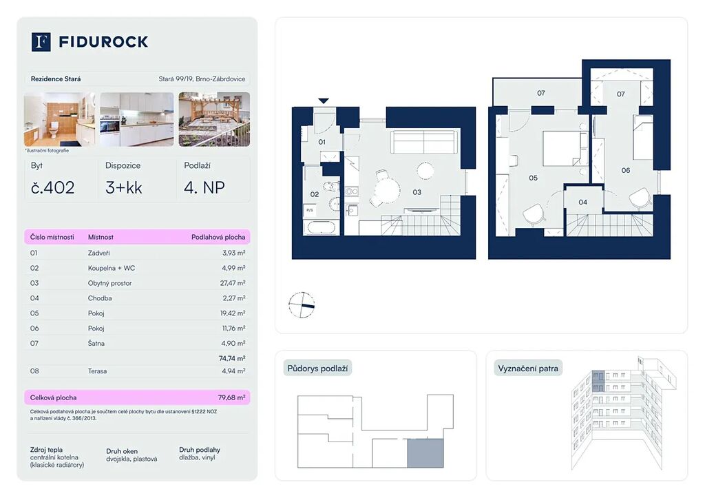 Nabízíme k prodeji krásný, světlý mezonetový byt 3+kk o velikosti 78,2 m² s terasou, nacházející se v 4. nadzemním podlaží zrekonstruovaného domu na ulici Stará 19, Brno – střed.