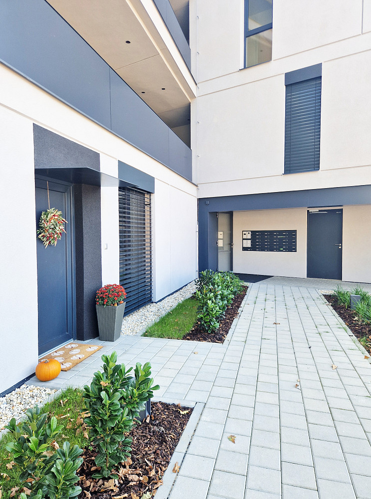 Prostorný interiér bytu je navržen s důrazem na funkčnost a komfort. K bytu náleží terasa, která přechází v předzahrádku o rozloze 120 m², přístupnou z obývacího pokoje a obou ložnic, ideální pro relaxaci. K bytu náleží elektrifikovaný sklep o velikosti 3 m², který poskytuje dodatečný úložný prostor. K bytu je dispozici jsou dvě výhradní parkovací místa přímo u vstupu do bytu, což zajišťuje pohodlné parkování.