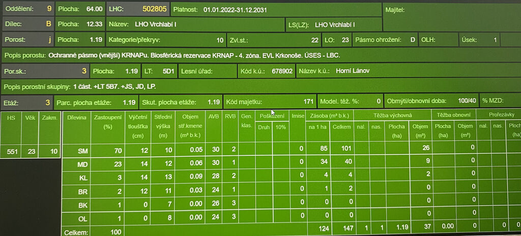 Prodej lesního pozemku a pozemku vedeného jako ostatní plocha v katastrálním území Horní Lánov, obec Lánov, okr. Trutnov. Jedná se o pozemek p.č. 3066 o výměře 11.269 m² (lesní pozemek) a o pozemek p.č. 3057 o výměře 4.009 m² (ostatní plocha). Celková výměra pozemků činí 15.278 m². Pozemky jsou situovány na rovině až mírně svažitém terénu. Pozemek ostatní plochy je veden jako ostatní komunikace a slouží jako přístupová cesta k lesnímu pozemku. Na pozemku se nachází stromořadí lemující nezpevněnou cestu. Na ploše lesního pozemku se nachází lesní porost smrku, modřínu, javoru, buku, olše a břízy ve věku 26 let. Lesní porost je udržovaný, zdravý a bez těžebního zásahu. Lze zde provést výchovnou těžbu v objemu 37 m3. Oba pozemky jsou dobře přístupné. Foto je aktuální. List vlastnictví č. 748. Informace na tel. nebo e-mailu.