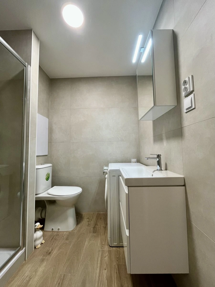 Byt je částečně vybavený. V kuchyni najdete sklokeramickou desku, digestoř, elektrickou troubu a vestavěnou lednici. Velký, světlý pokoj nabízí dostatek prostoru pro obývací část i ložnici a má přímý vstup na balkón. Koupelna je vybavena sprchovým koutem, umyvadlem, toaletou a pračkou.
