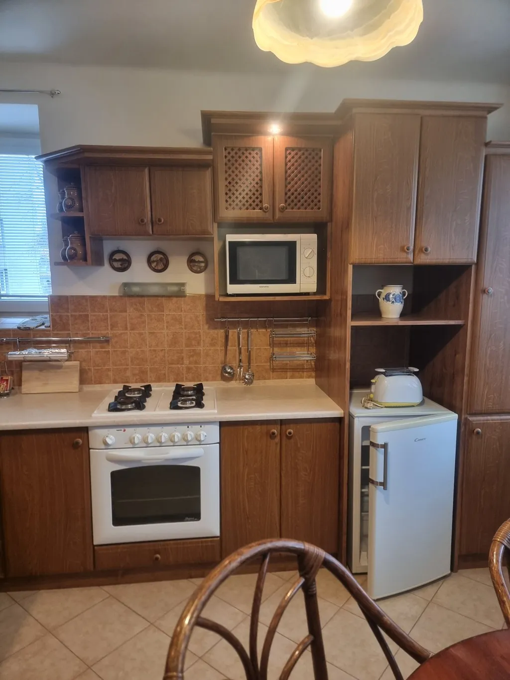 Kuchyně je vybavena základním vybavením včetně lednice, s možností instalace myčky. V koupelně je vana. Podlahy jsou kombinací PVC a koberce.