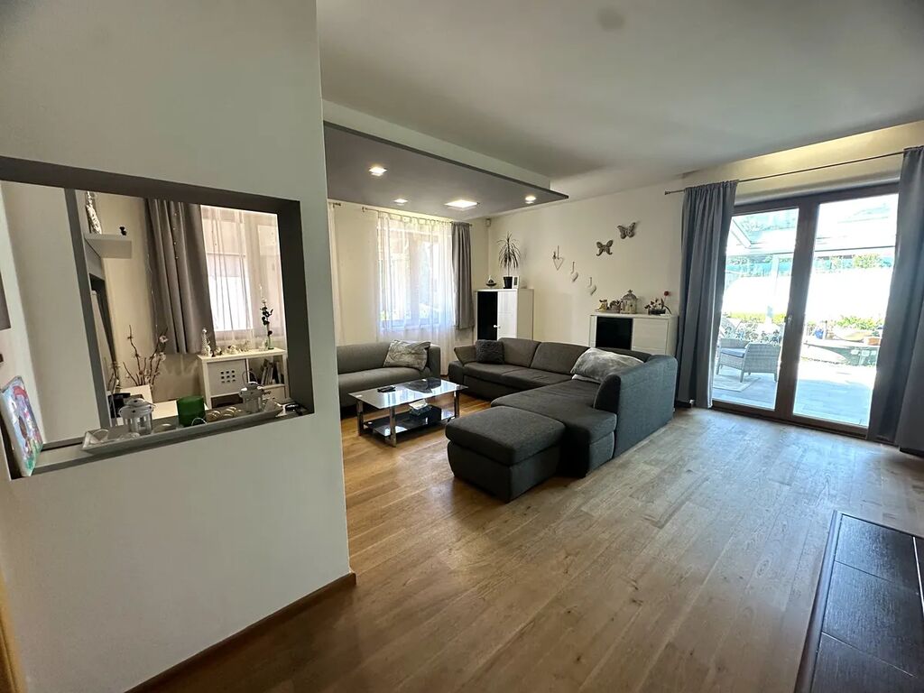 • Obývací pokoj s dřevěnou podlahou, krbem a vstupem na prosklenou krytou pergolu