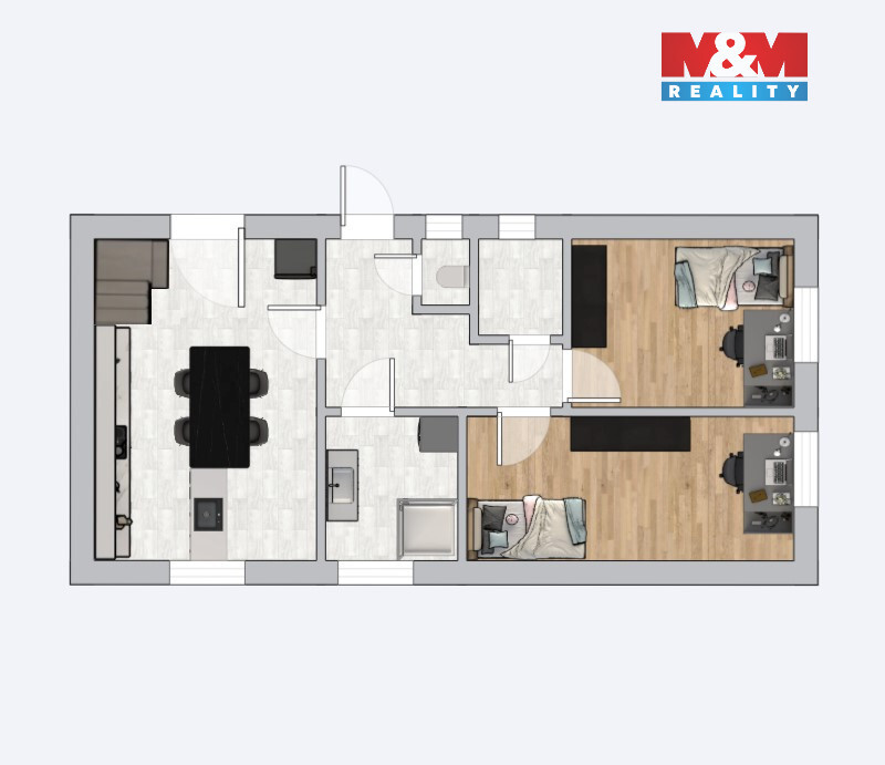 Dům je dvoupodlažní a nabízí celkem 5 místností. V přízemí se nachází moderní kuchyň, dva pokoje, koupelna se sprchovým koutem, samostatné WC a vstupní chodba. Patro je rozděleno na dvě prostorné místnosti.