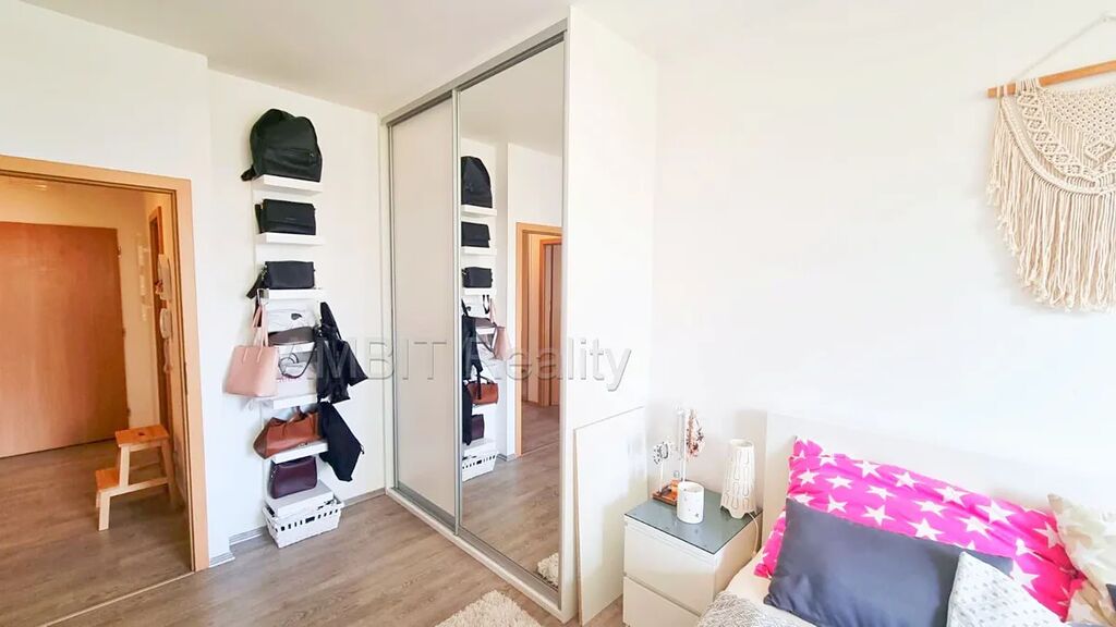 Tento moderní byt sestává z obývacího pokoje s kuchyňským koutem, ložnice, koupelny s WC, předsíně a balkónu. Byt se pronajímá zařízený - viz foto. Kuchyňský kout je vybavený novou moderní kuchyňskou linkou, elektrickým sporákem s indukční varnou deskou a elektrickou pečicí troubou, samostatně stojící lednicí s mrazákem, digestoří, mikrovlnnou troubou, potravinovou skříní a jídelním stolem se čtyřmi židlemi. V obývacím pokoji se nachází rozkládací rohová sedací souprava, konferenční stolek, křeslo, komoda, nízké úložné skříňky a televize (ostatní zařízení na foto je současného nájemce). Z obývacího pokoje lze vyjít na prostorný balkón. V ložnici je dvoulůžko s nočními stolky a vysoká vestavná šatní skříň se zrcadlovými dveřmi. Díky nim, stejně jako díky vysokým vestavěným skříním v předsíni, skýtá byt velké množství potřebných úložných prostor. V koupelně se nachází umyvadlo s podumyvadlovou skříňkou, vana, WC a automatická pračka s horním plněním.