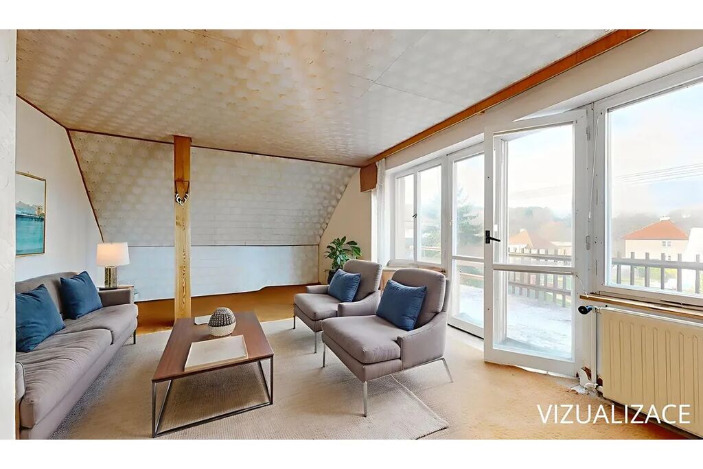 Přízemí (75,4 m): Světlý obývací pokoj (28,7 m), ložnice (14,9 m), kuchyně (7,6 m), koupelna (5,2 m), prostorná hala se schodištěm (11,5 m), samostatné WC a vstupní chodba.