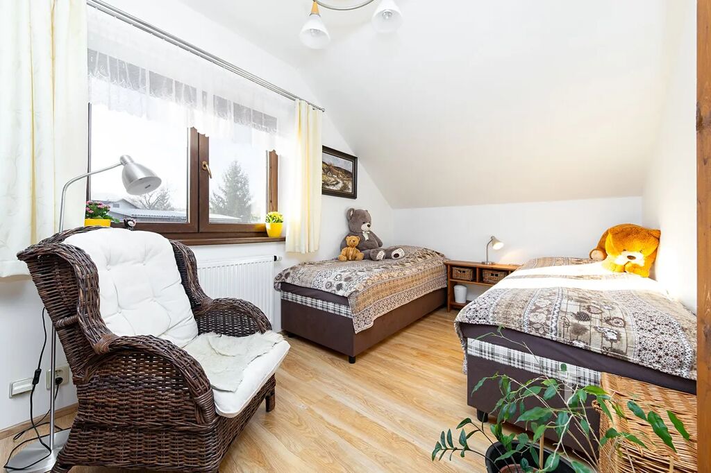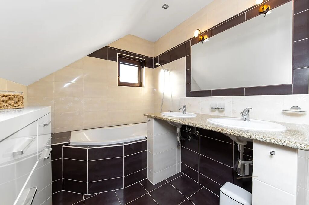 V druhém nadzemním podlaží se nachází klidová část domu tvořená třemi samostatnými pokoji, které nabízejí široké možnosti využití jako ložnice, dětské pokoje či pracovny. K dispozici jsou také dvě šatny poskytující dostatek úložného prostoru. Součástí patra je prostorná koupelna s vanou a dvěma umyvadly a také samostatná toaleta, což zajišťuje komfortní fungování domácnosti.
