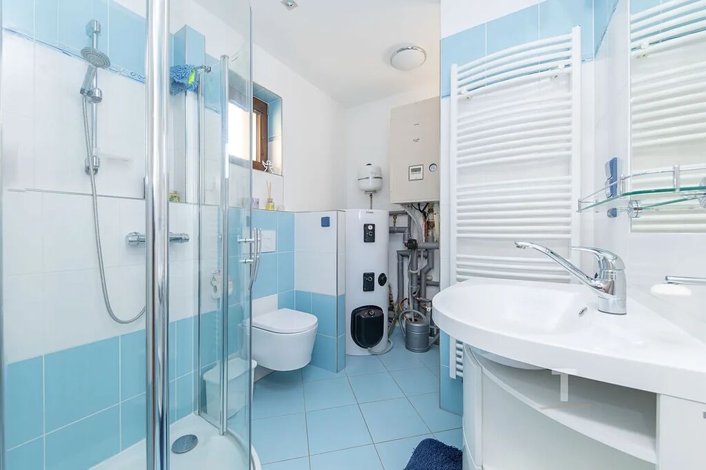 Vytápění je řešeno tepelným čerpadlem v kombinaci s podlahovým vytápěním a radiátory a útulnou atmosféru obývacího pokoje podtrhuje krb, který tvoří přirozené centrum rodinného života. Celková užitná plocha domu činí přibližně 176 m² včetně terasy (cca 10,5 m²) a garáže (cca 38 m²), jejíž součástí je praktická dílna se vstupem přímo z interiéru.