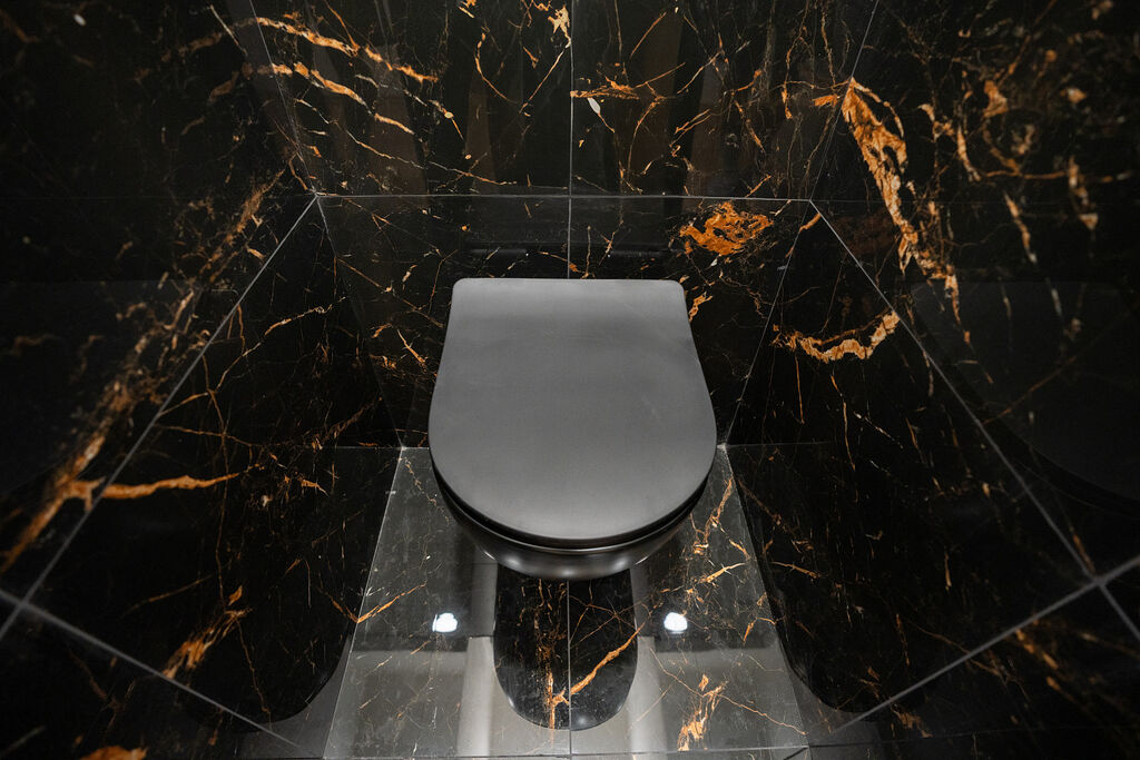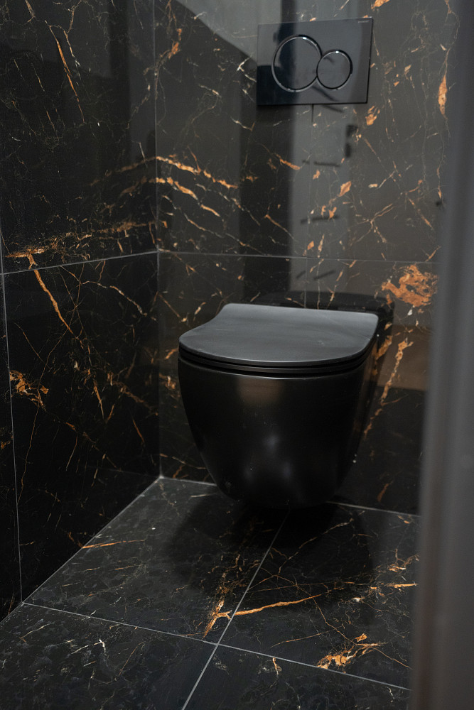 Koupelna a samostatné WC jsou laděny do elegantního stylu s výraznými obklady v černém mramorovém designu. V koupelně se nachází prostorný walk-in sprchový kout bez vaničky, designové zrcadlo s dotykovým ovládáním a černé baterie, které esteticky navazují na styl celého bytu.