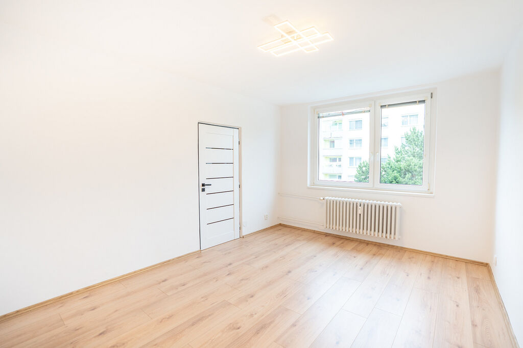 Dispozičně je byt rozdělen na předsíň, kuchyni s oknem, obývací pokoj, ložnici se vstupem na balkon, koupelnu, samostatné WC a praktickou středovou místnost mezi pokoji, která je ideální jako šatna, komora nebo domácí pracovní kout.
