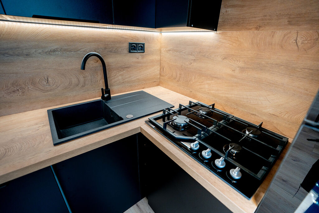 Byt prošel rozsáhlou rekonstrukcí, byly realizovány nové podlahy, omítky, interiérové dveře i vybavení. V části bytu byly rovněž obnoveny elektrické rozvody a rozvody vody. Kuchyňská linka v kombinaci černé barvy a dřevodekoru působí moderně a elegantně. Je vybavena granitovým dřezem s černou baterií a vestavěnými spotřebiči, myčkou Bosch, mikrovlnnou troubou Bosch, troubou Beko, plynovou varnou deskou Mora a lednicí s mrazákem značky Beko. Vše doplňuje praktické LED podsvícení.