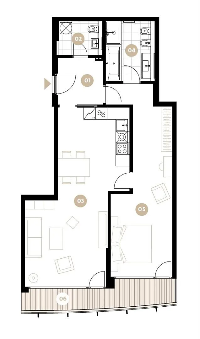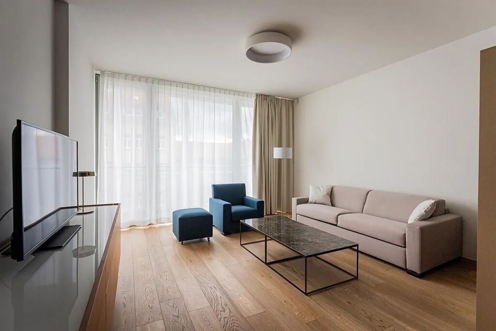 Stylově zařízený byt 2+kk (1 ložnice, 1 koupelna), s terasou (9,49m2) a obytnou plochou 78,7m2, je situován ve 3. patře zcela nového luxusního rezidenčního komplexu s výtahem, recepcí, bazénem, saunou, prostornou zahradou ve dvoře, sklepem a možností parkování v podzemním parkovišti.