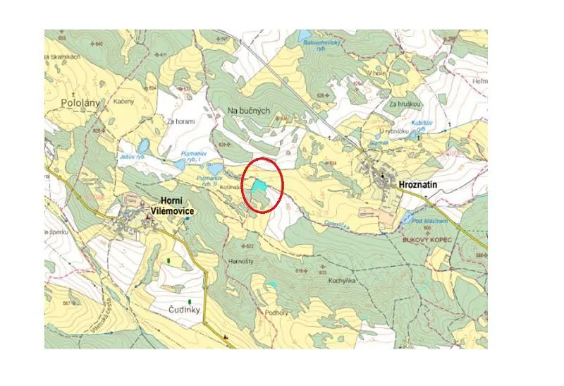 Lesní pozemek nepravidelného tvaru, nacházející se mezi zemědělskými pozemky a privátními lesy, přístupný přes zemědělské pozemky. Lesní porost byl zcela vytěžen – nezalesněná holina.