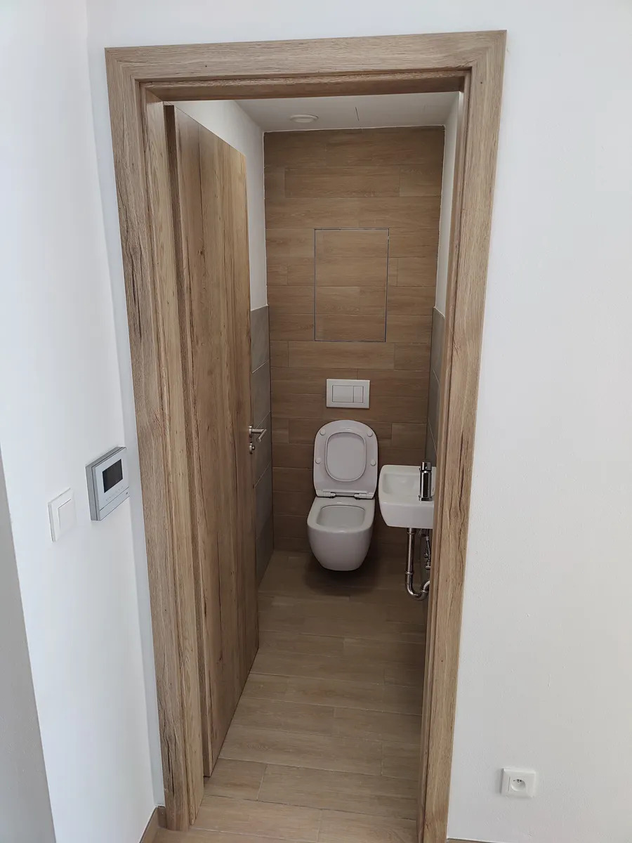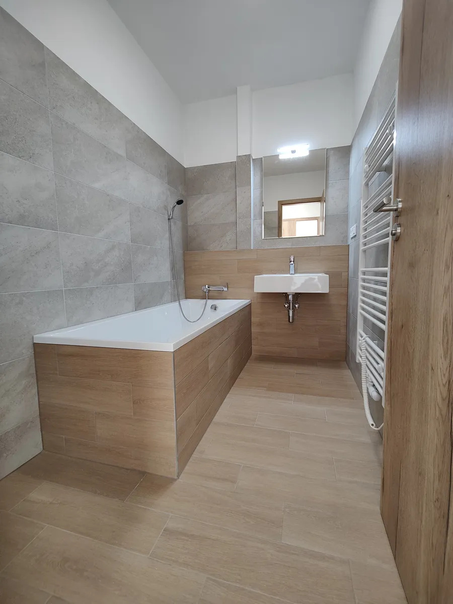 V koupelně se nachází vana, umyvadlo, zrcadlo s osvětlením a otopný žebříkový radiátor (včetně el. patrony). Samozřejmostí je příprava odpadu pro pračku i sušičku, což oceníte při každodenním používání. V ložnici a obývacím pokoji spojeným s kuchyní je použita plovoucí podlaha v dekoru imitace dřeva, zatímco v ostatních místnostech je položena keramická dlažba, která je nejen estetická, ale i snadno udržovatelná.