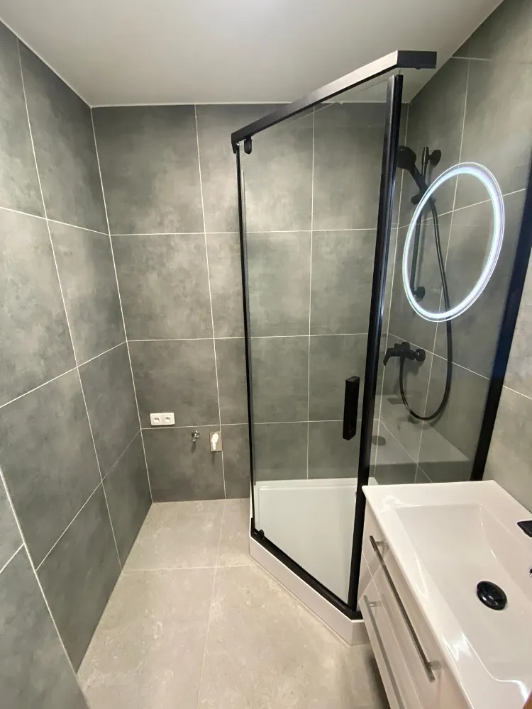 Byt je vybaven moderní kuchyňskou linkou na míru včetně vestavěných spotřebičů BOSCH. Koupelna i samostatné WC jsou laděny do elegantního šedého designu s použitím kvalitních značkových materiálů. Samozřejmostí jsou nové plovoucí podlahy, interiérové dveře i zárubně.