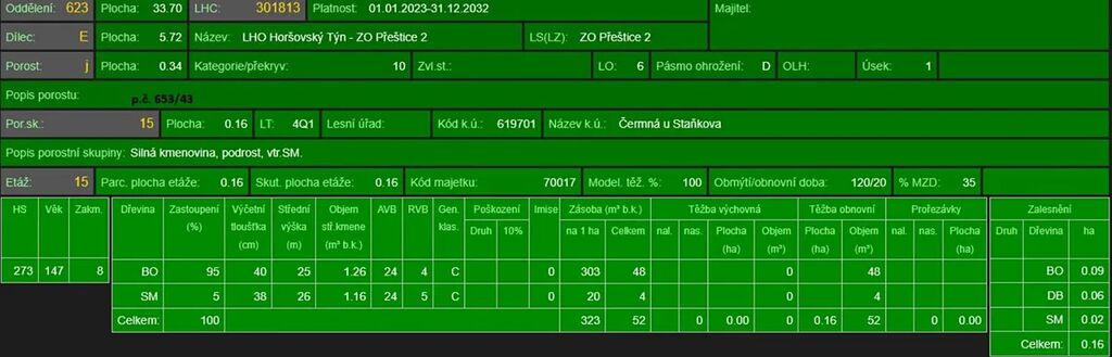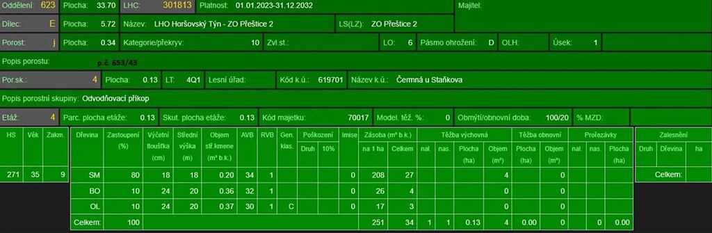 - p.č. 653/43 vedená jako lesní pozemek o celkové výměře 3 381 m2 (stáří lesa 149 let - zastoupení dřevin borovice, smrk, stáří lesa 37 let - zastoupení dřevin smrk, borovice, olše )