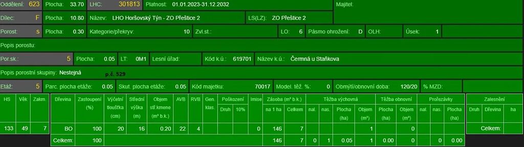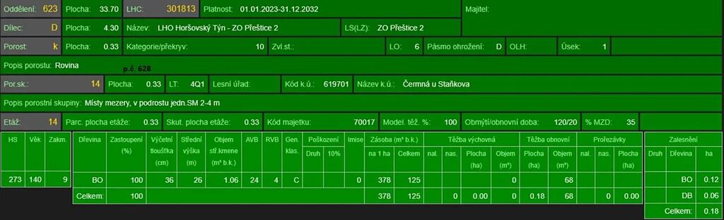 - p.č. 628 vedená jako lesní pozemek o celkové výměře 3 399 m2 (stáří lesa 142 let - zastoupení dřevin borovice )