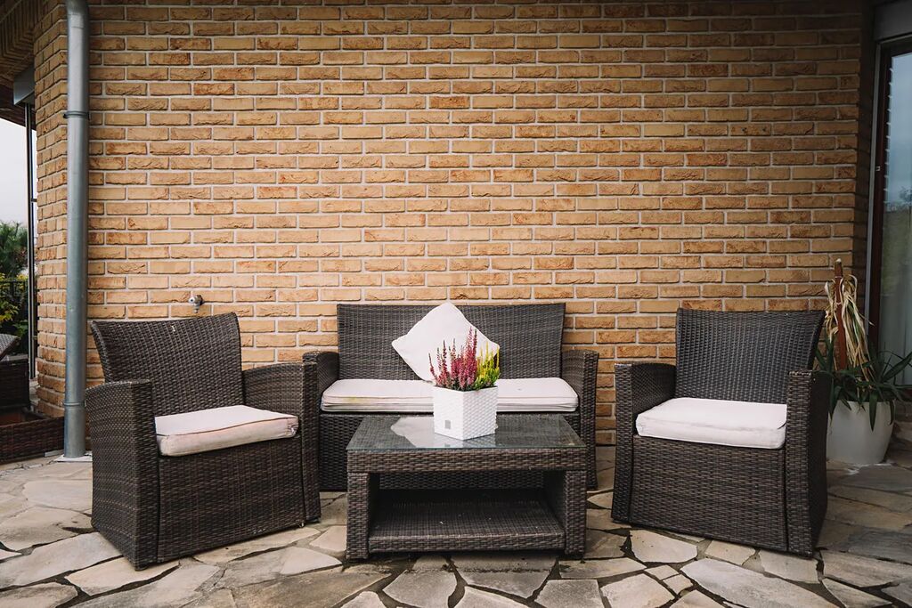Kolem domu se rozprostírá prostorná terasa s posezením a grilem, na kterou lze vstoupit z každé místnosti a je z ní krásný výhled na okolní krajinu.