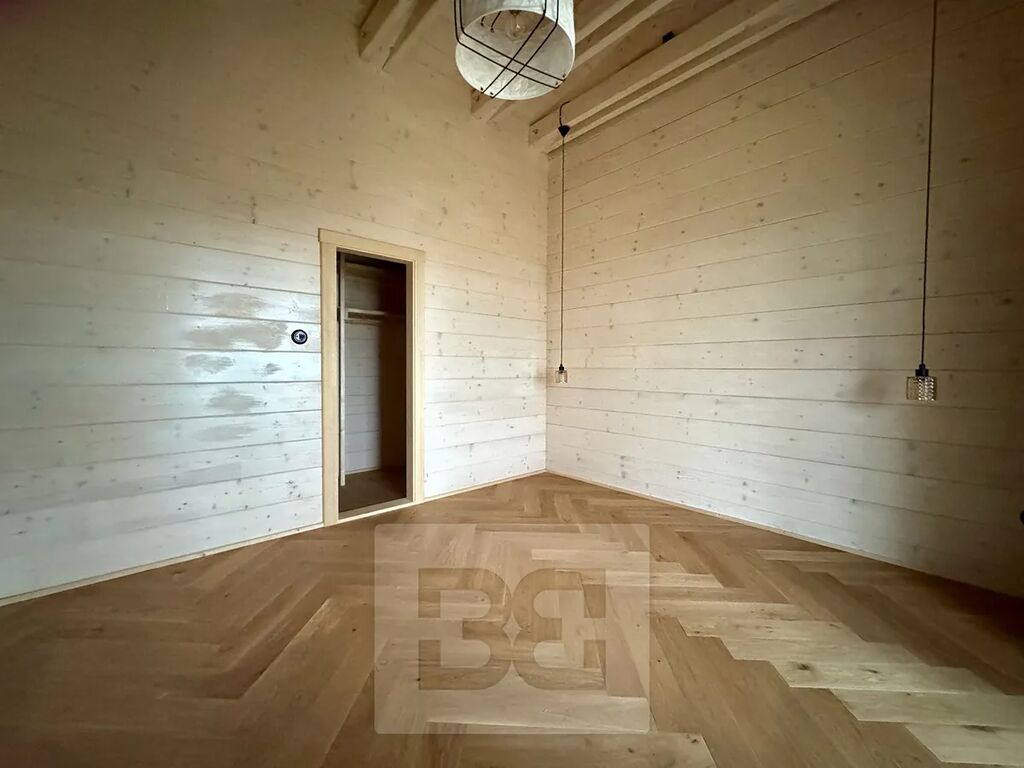 U ložnice je samostatná šatna s dřevěným systémem polic a závěsů, celý prostor v jednotném designu.