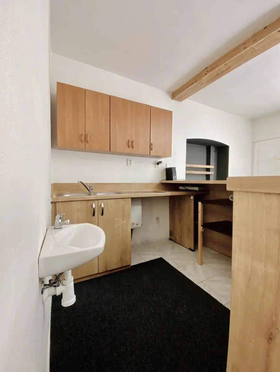Dispozice: kuchyňská linka s barem (30 m), WC s umyvadlem, kancelář nebo menší pokoj, koupelna s WC a sprchovým koutem