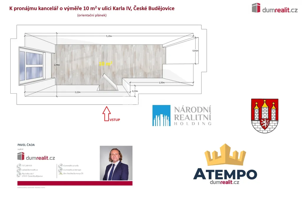 Dumrealit.cz Vám zprostředkuje pronájem světlých komerčních prostor o celkové ploše 10 m² v exkluzivní lokalitě na náměstí Přemysla Otakara II., České Budějovice. Prostory lze využít jako kancelář. Podrobné rozkreslení prostoru naleznete na orientačním plánku mezi fotografiemi. Nájemné činí 1.744,- Kč + poplatky 1.351,- Kč měsíčně. Doporučuji osobní prohlídku, prostor je připraven k užívání. Více informací Vám poskytne realitní makléř Pavel Čada z RK A TEMPO fungující pod ochranou známkou dumrealit. Ev. číslo: 653226.